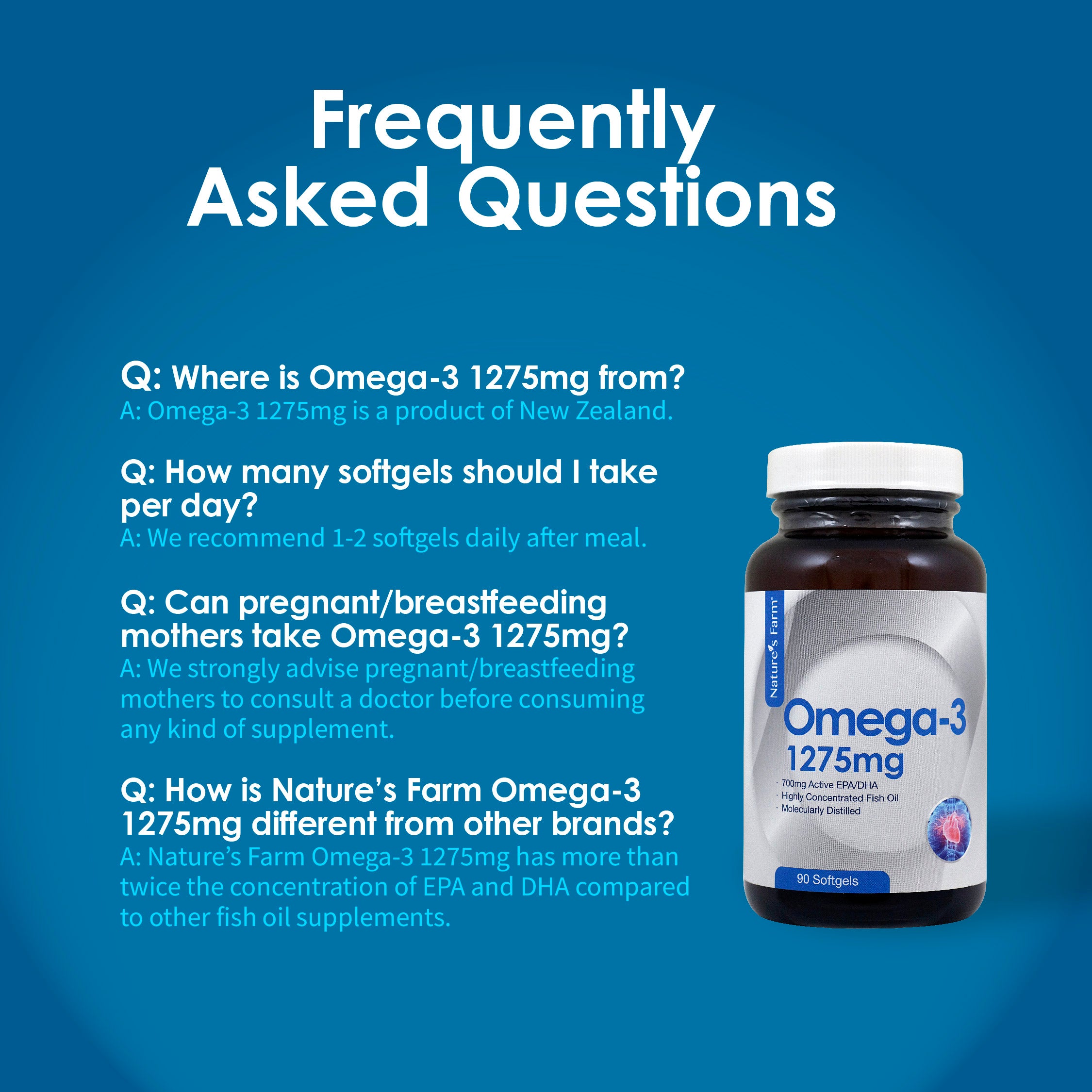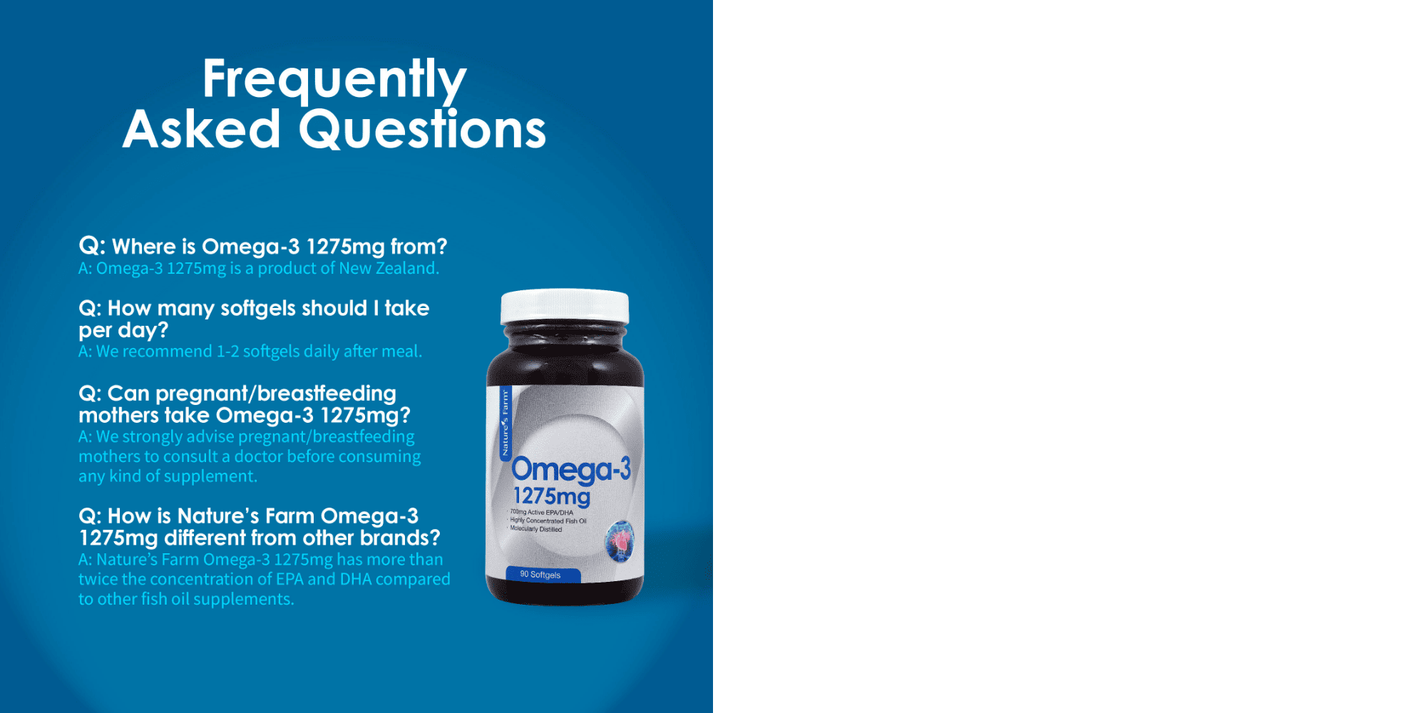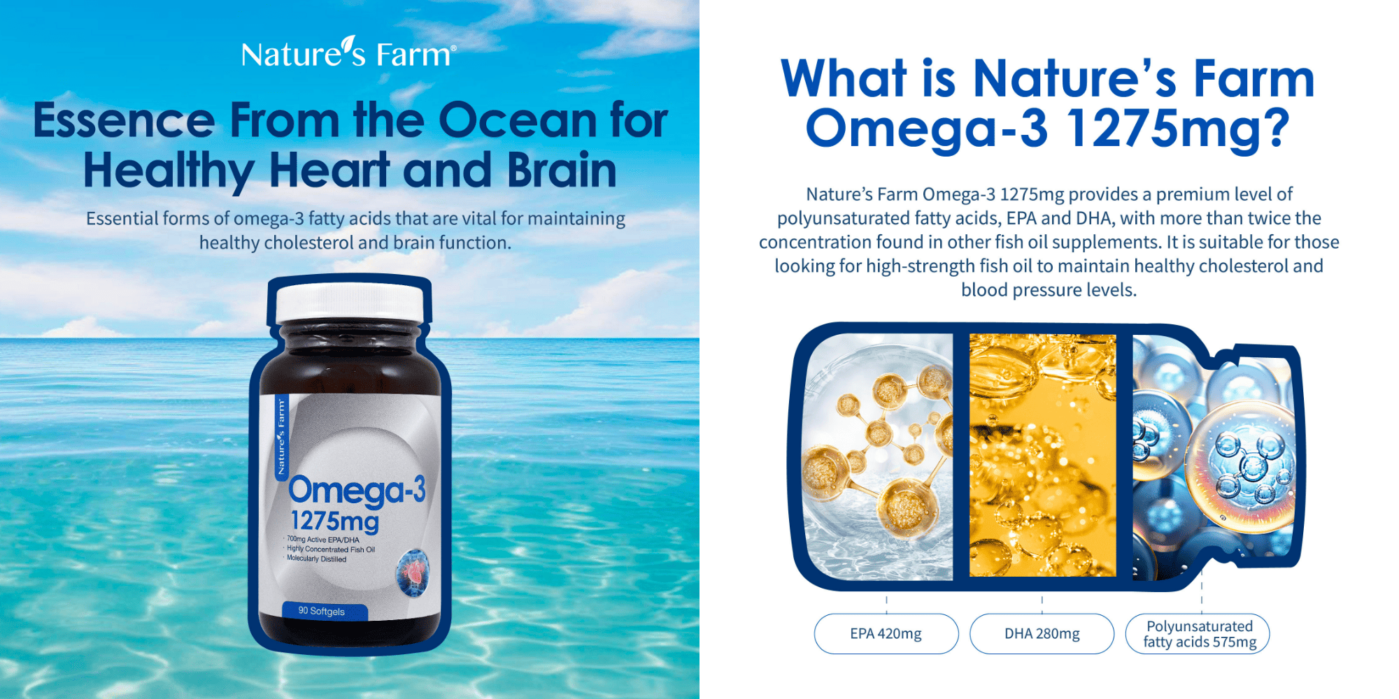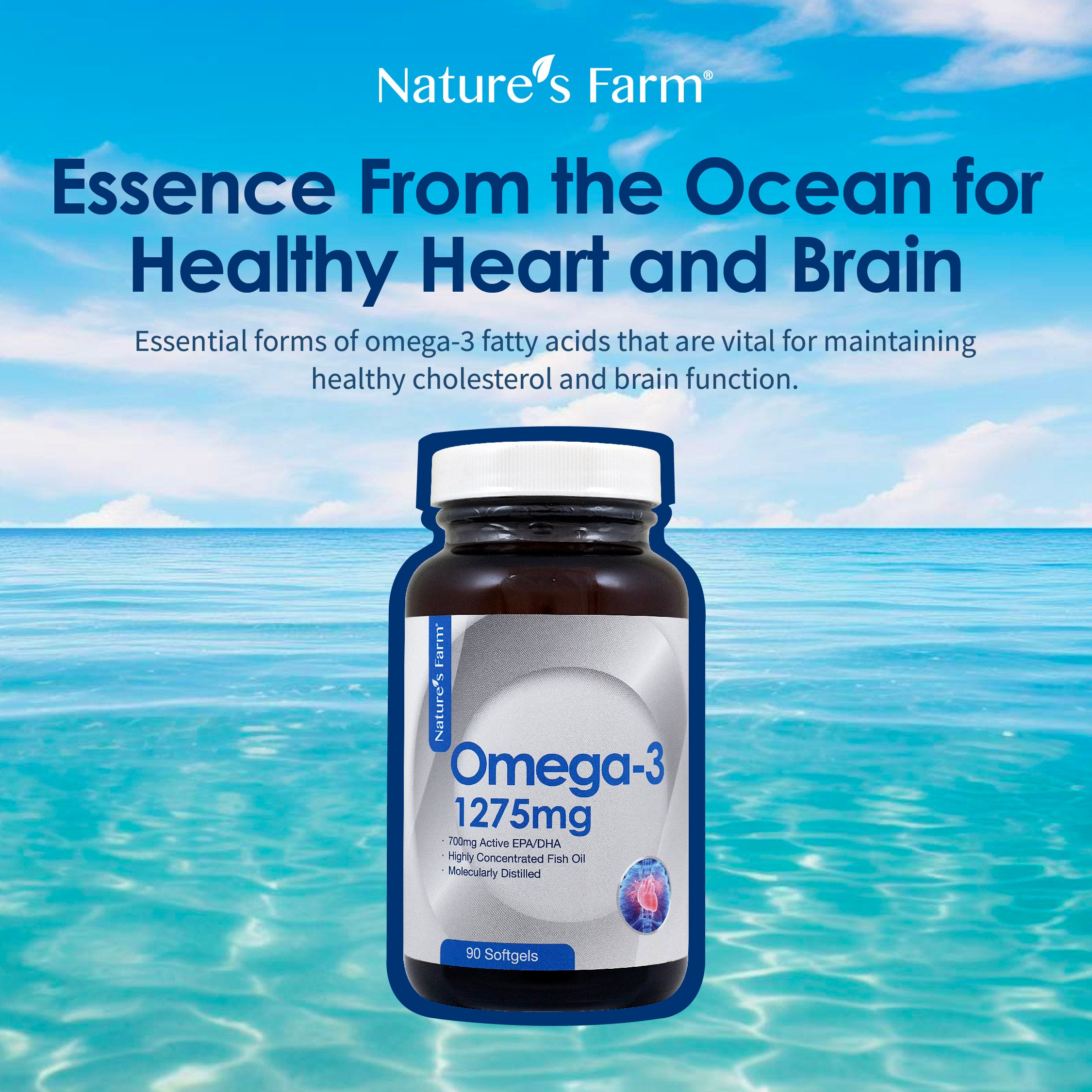 Nature’s Farm® Omega-3 Fish Oil 1275mg offers 420mg active Eicosapentaenoic Acid (EPA) and 280mg Docosahexaenoic Acid (DHA) per softgel – more than 2 times the concentration of EPA and DHA found in other fish oil supplements. This formula provides extra benefits to promote healthy heart function, regulate blood pressure, maintain healthy cholesterol level, improve vision and skin health, boost mental performance, relieve joint discomfort and strengthen the immune system.