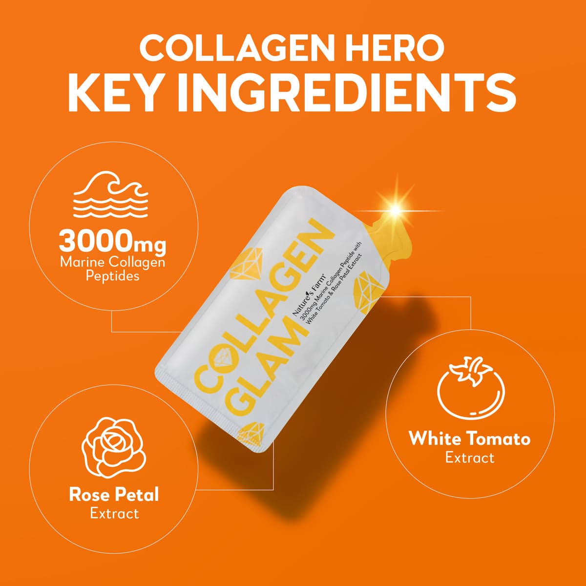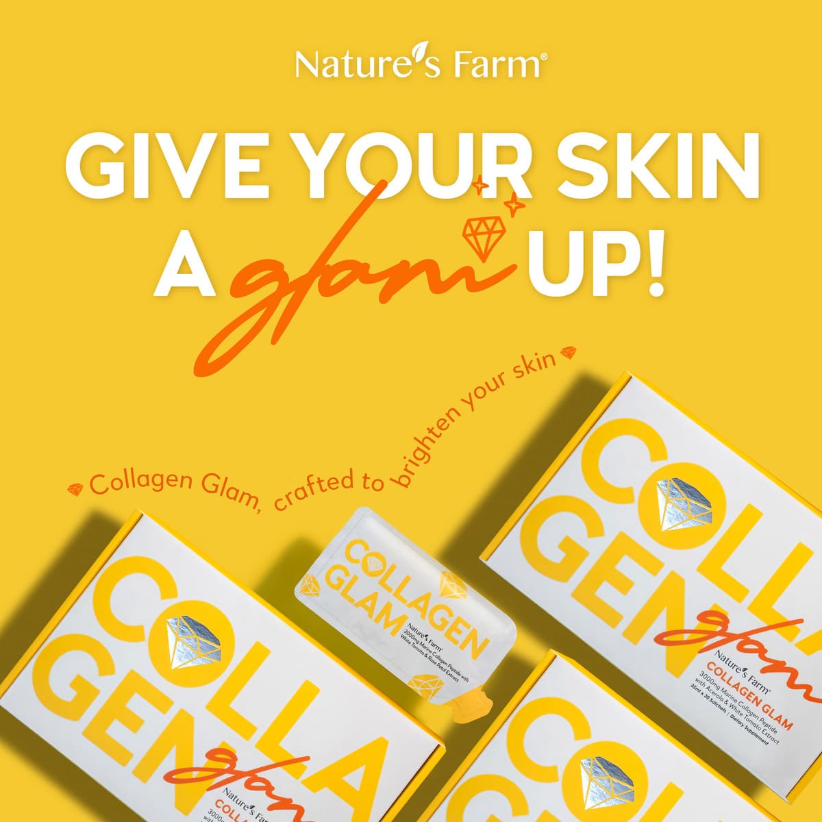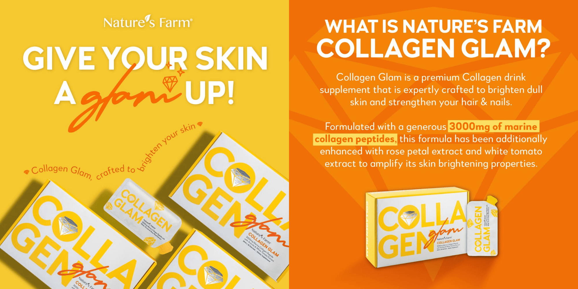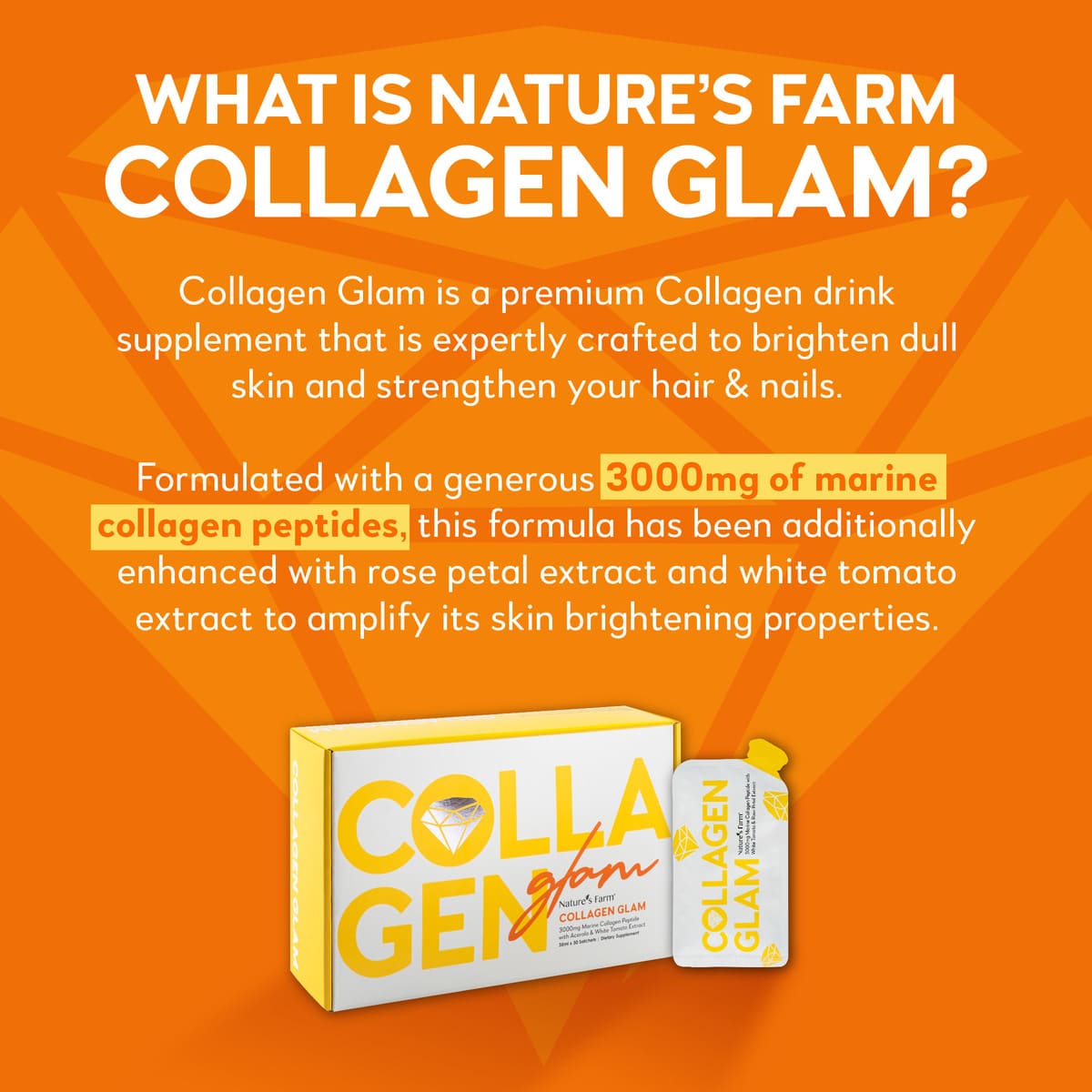 Nature’s Farm Collagen Glam is a premium Collagen drink supplement that is expertly crafted to brighten dull skin and strengthen your skin & nails. Formulated with a generous 3000mg of marine collagen peptides, this forumal has been additonally enhanced with rose petal extract and white tomato extract to amplify its skin brightening properties.