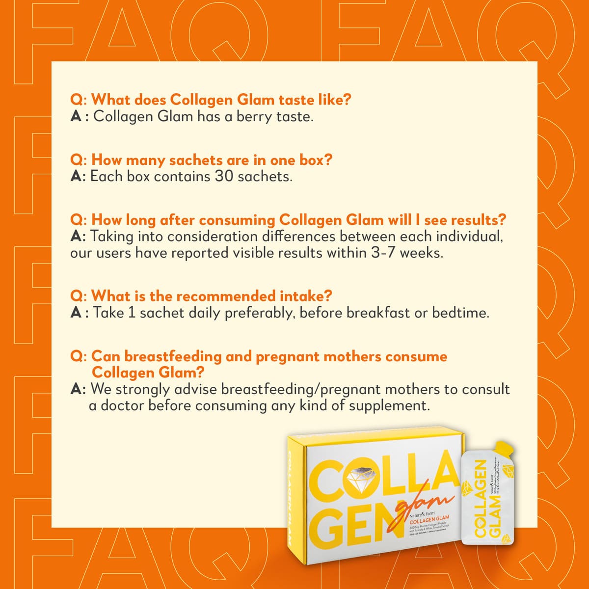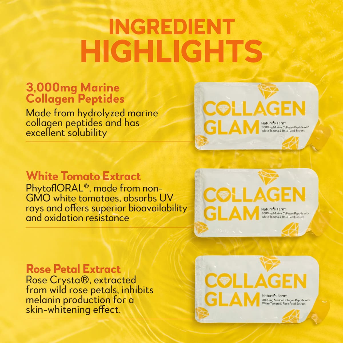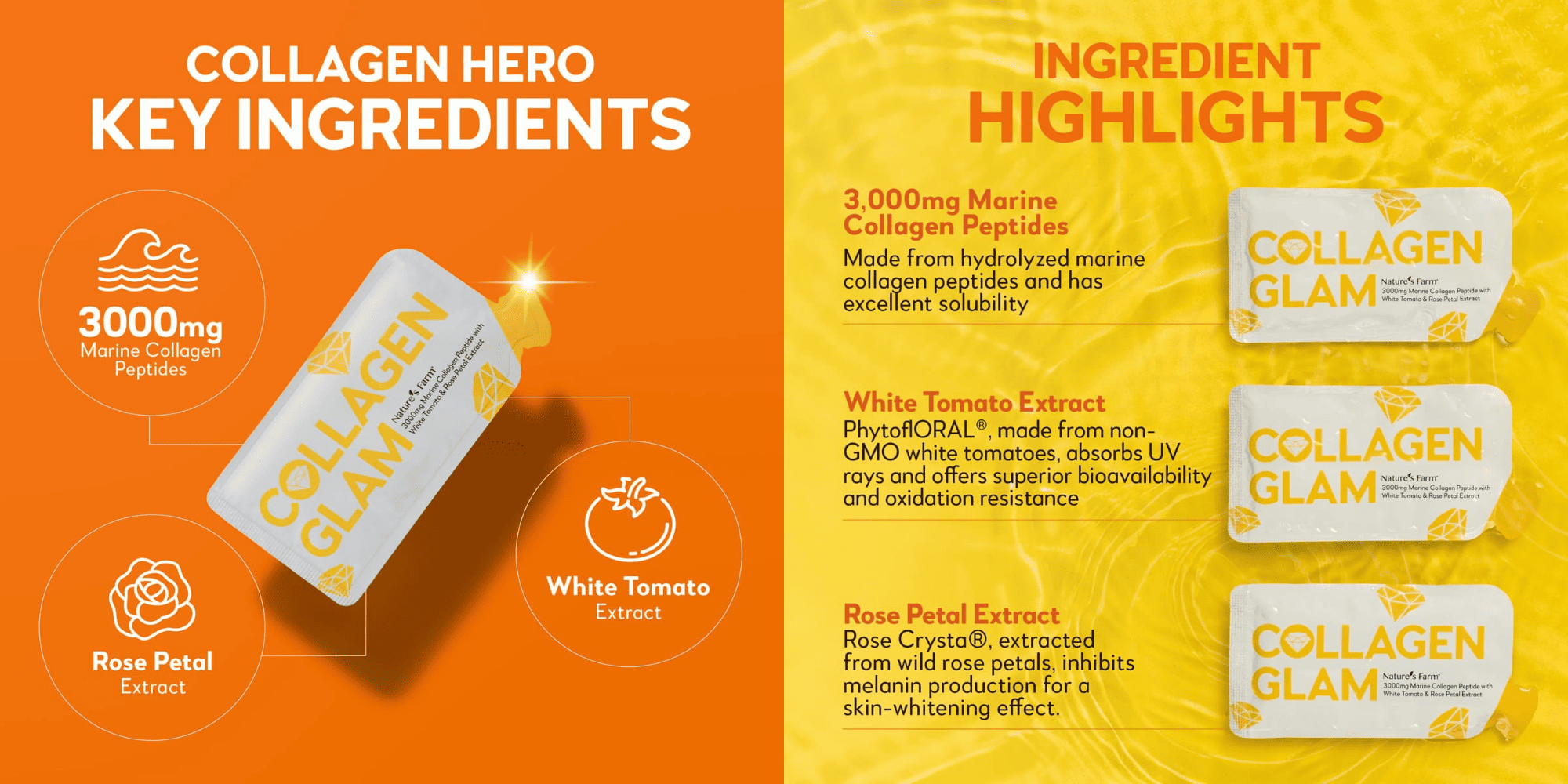 Nature’s Farm Collagen Glam is a premium Collagen drink supplement that is expertly crafted to brighten dull skin and strengthen your skin & nails. Formulated with a generous 3000mg of marine collagen peptides, this forumal has been additonally enhanced with rose petal extract and white tomato extract to amplify its skin brightening properties.