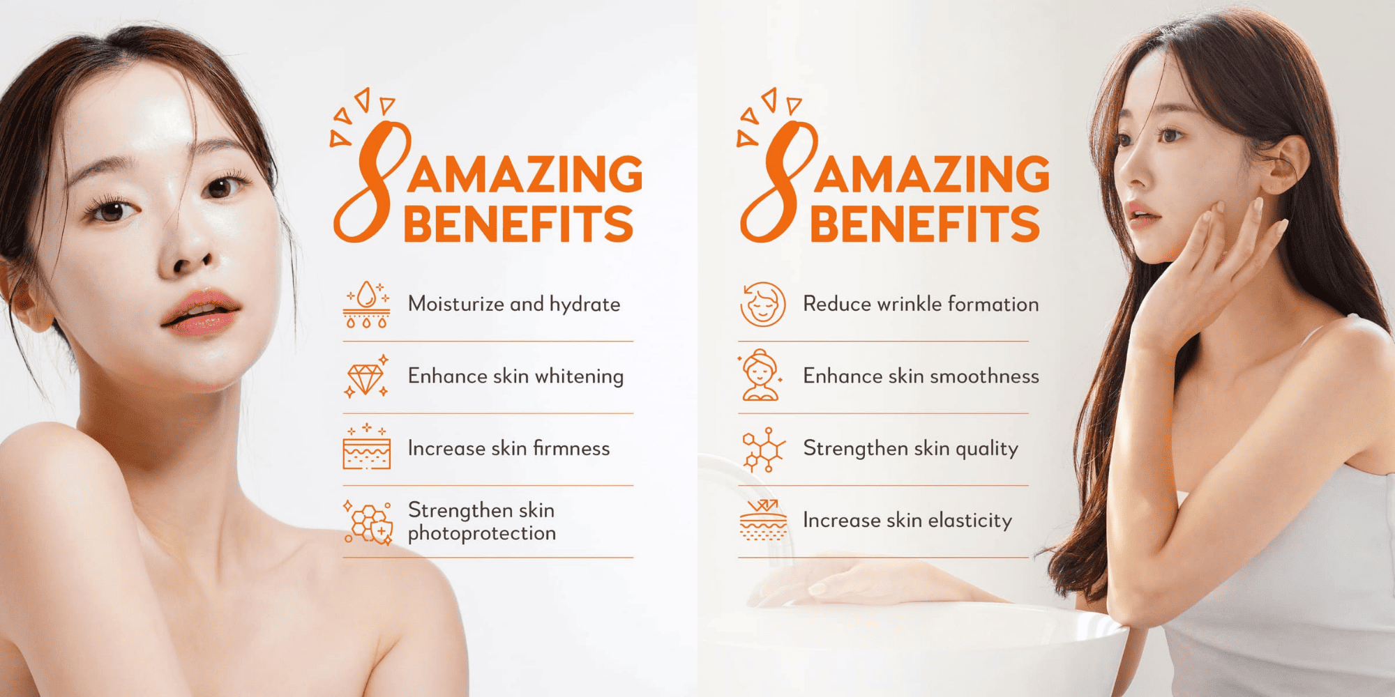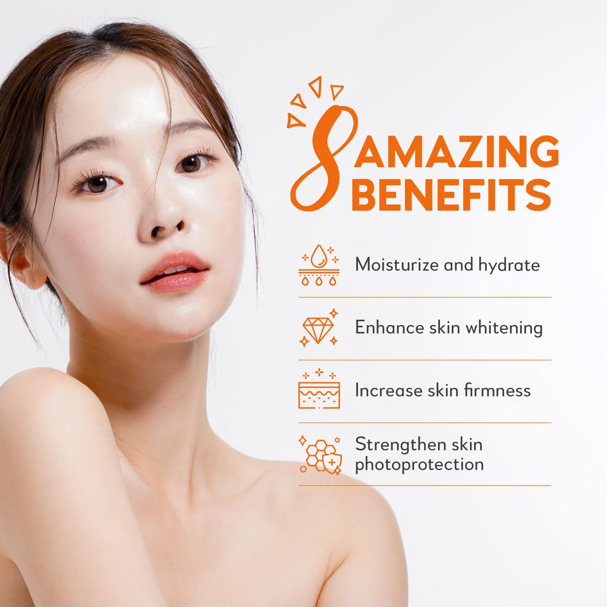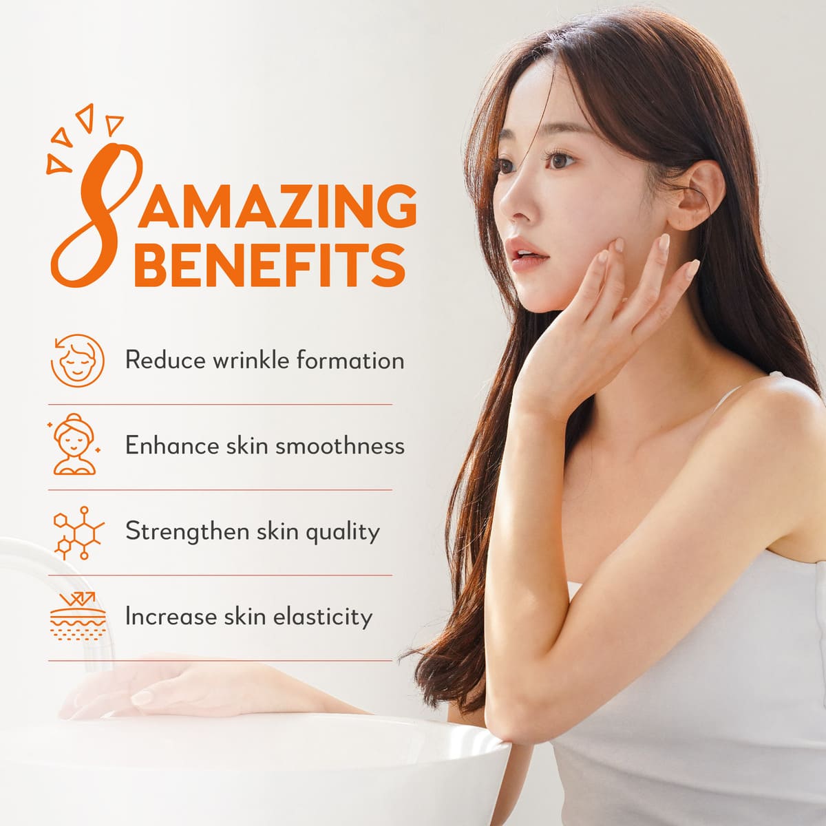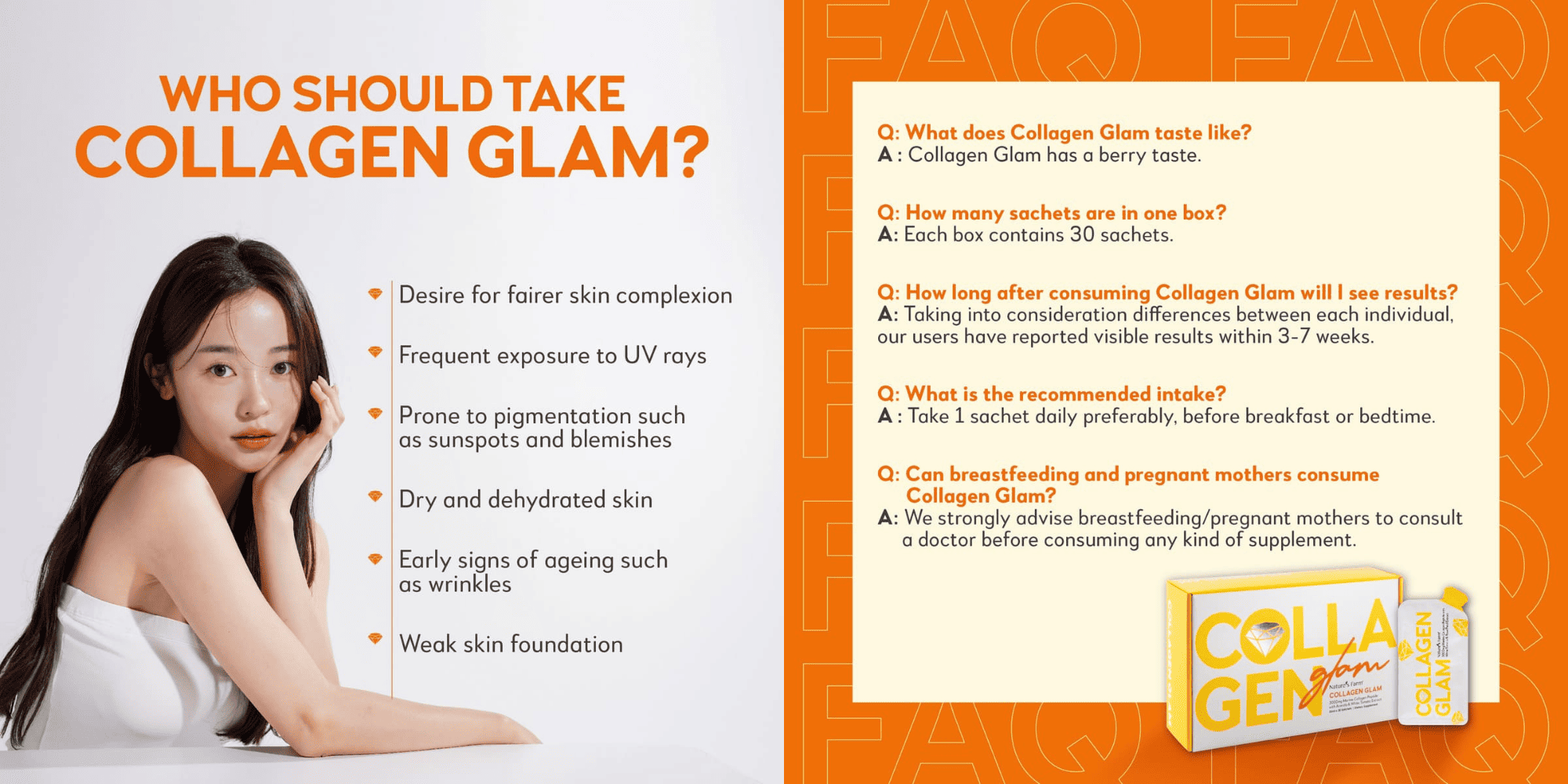 Nature’s Farm Collagen Glam is a premium Collagen drink supplement that is expertly crafted to brighten dull skin and strengthen your skin & nails. Formulated with a generous 3000mg of marine collagen peptides, this forumal has been additonally enhanced with rose petal extract and white tomato extract to amplify its skin brightening properties.