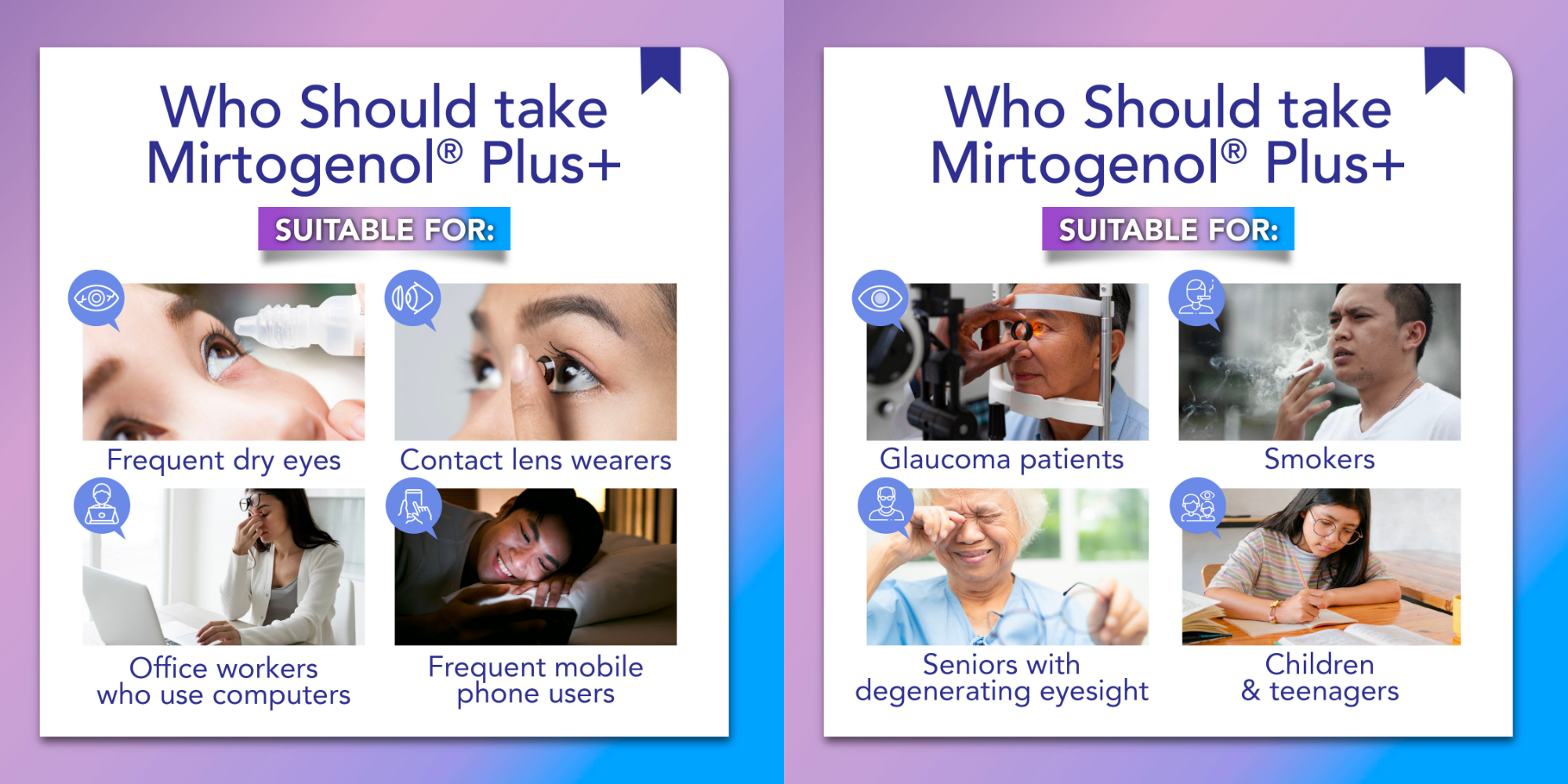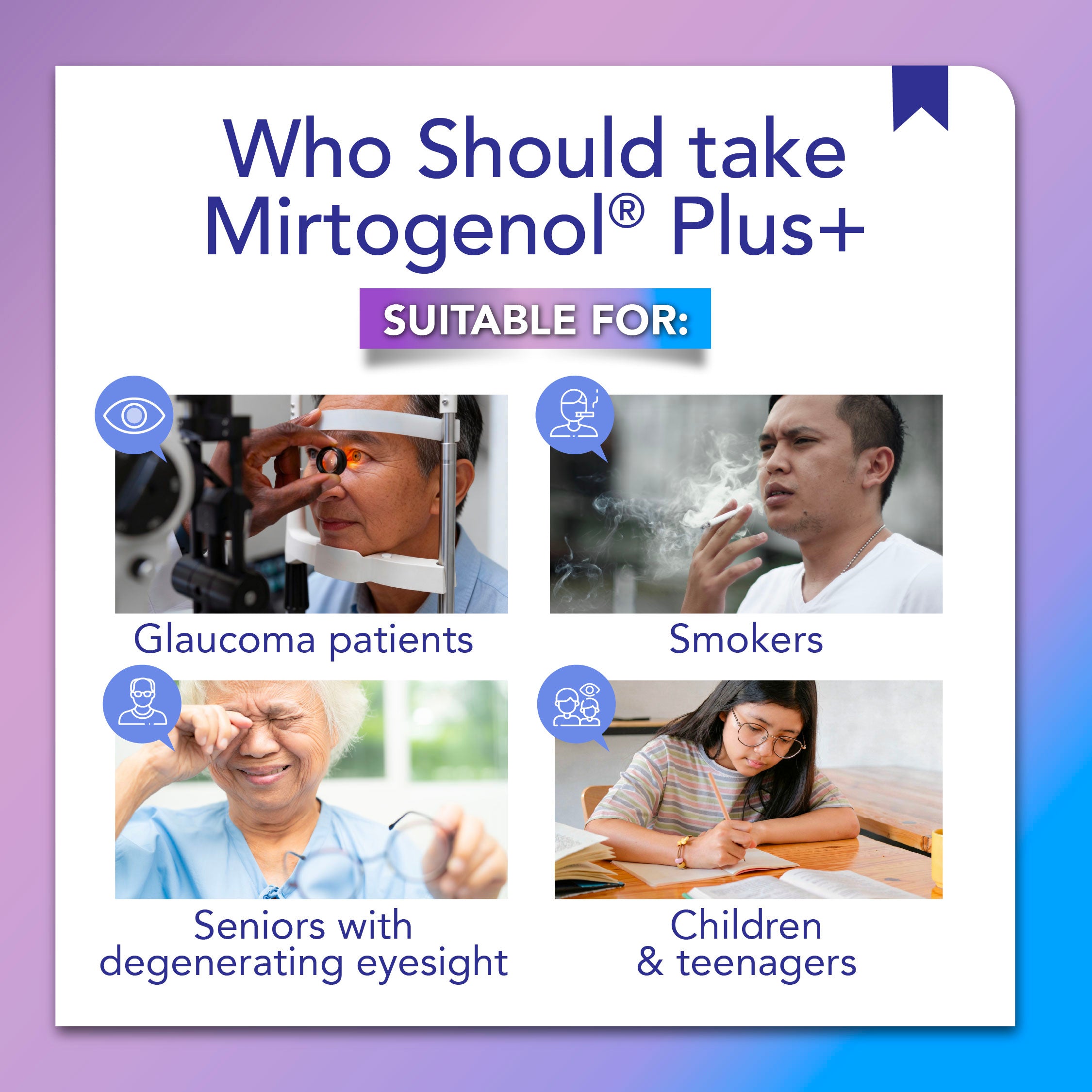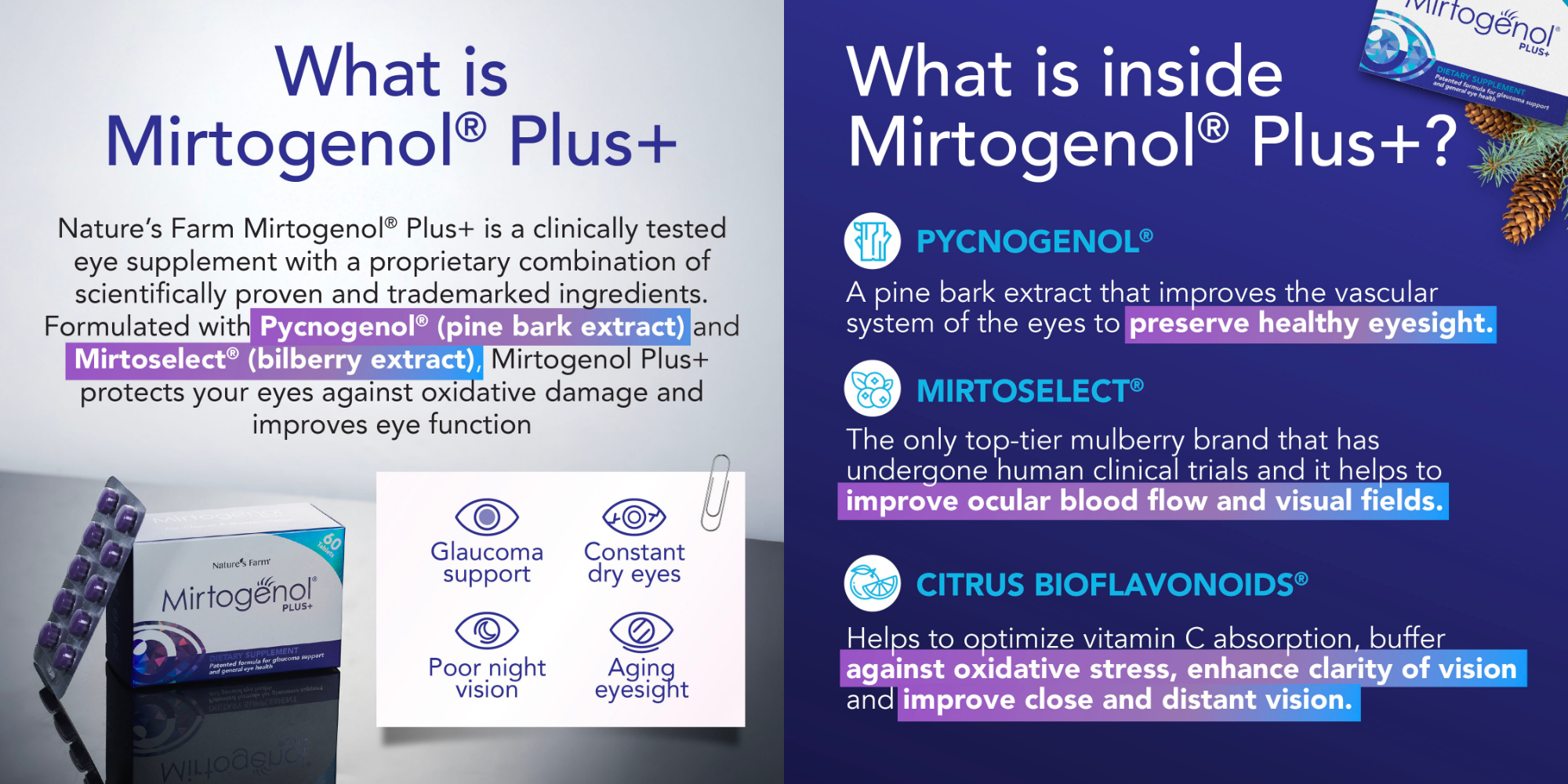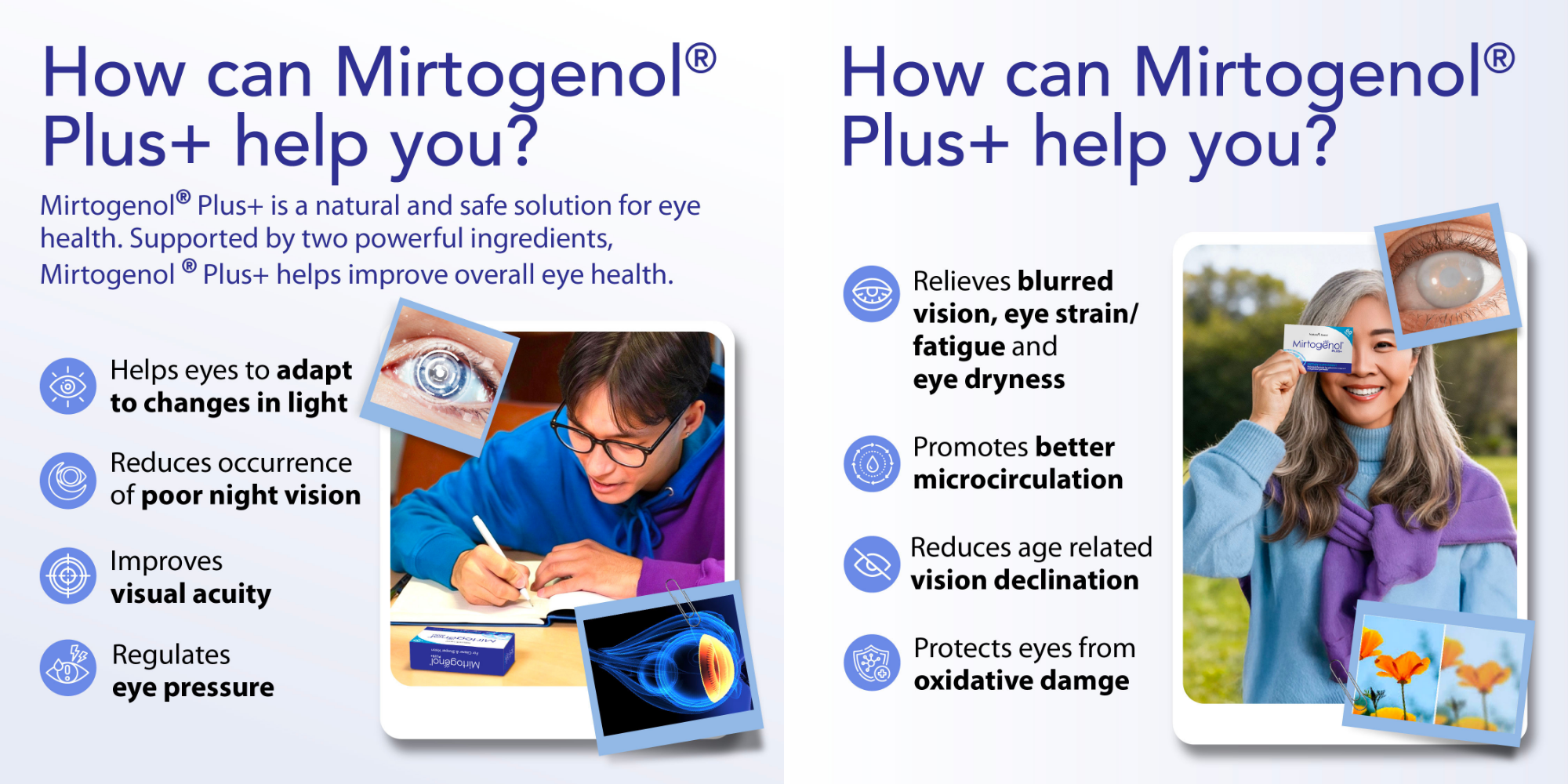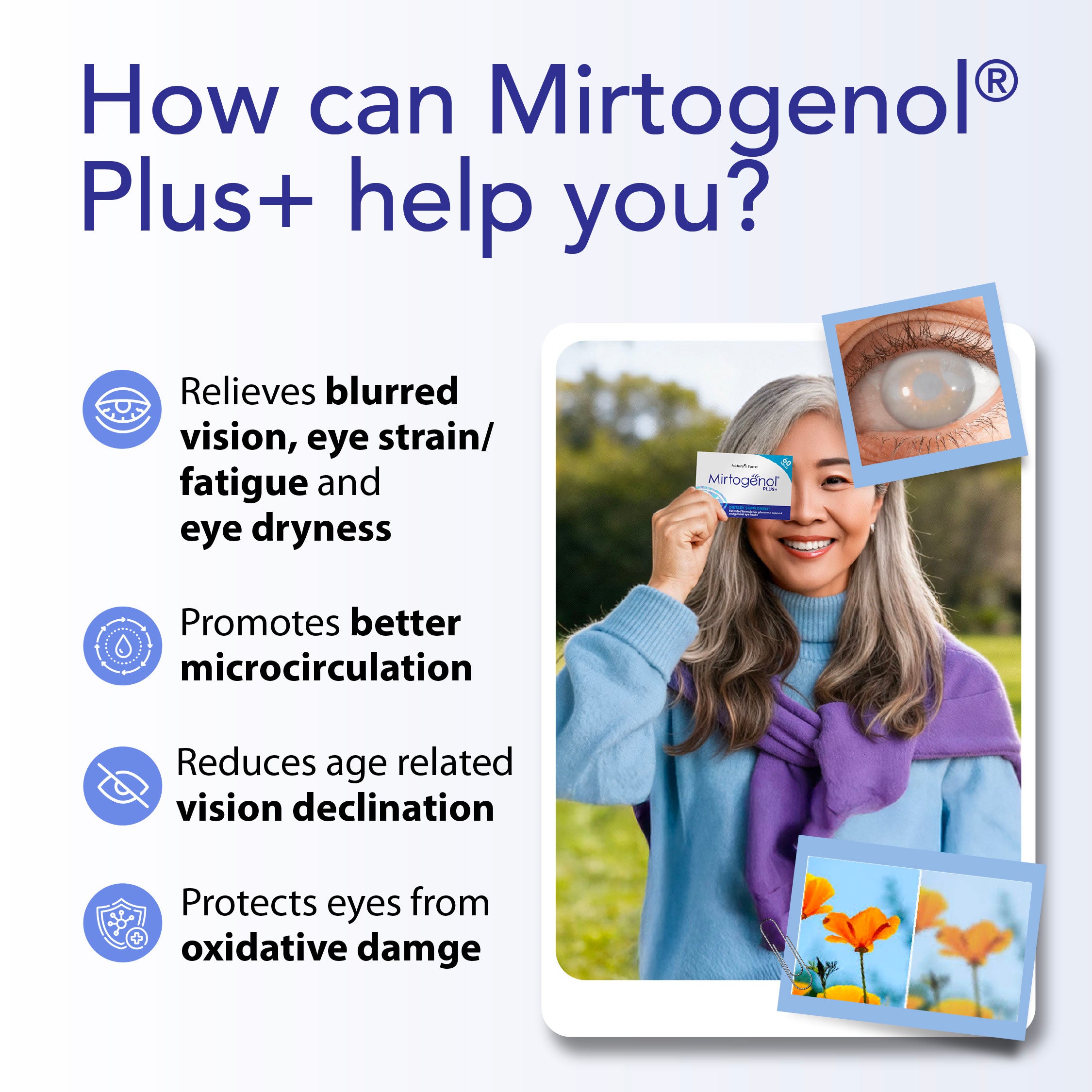 Mirtogenol® Plus+ is a natural and safe solution for eye health. Supported by two powerful ingredients, Mirtogenol® Plus+ will help improve your eye health by: