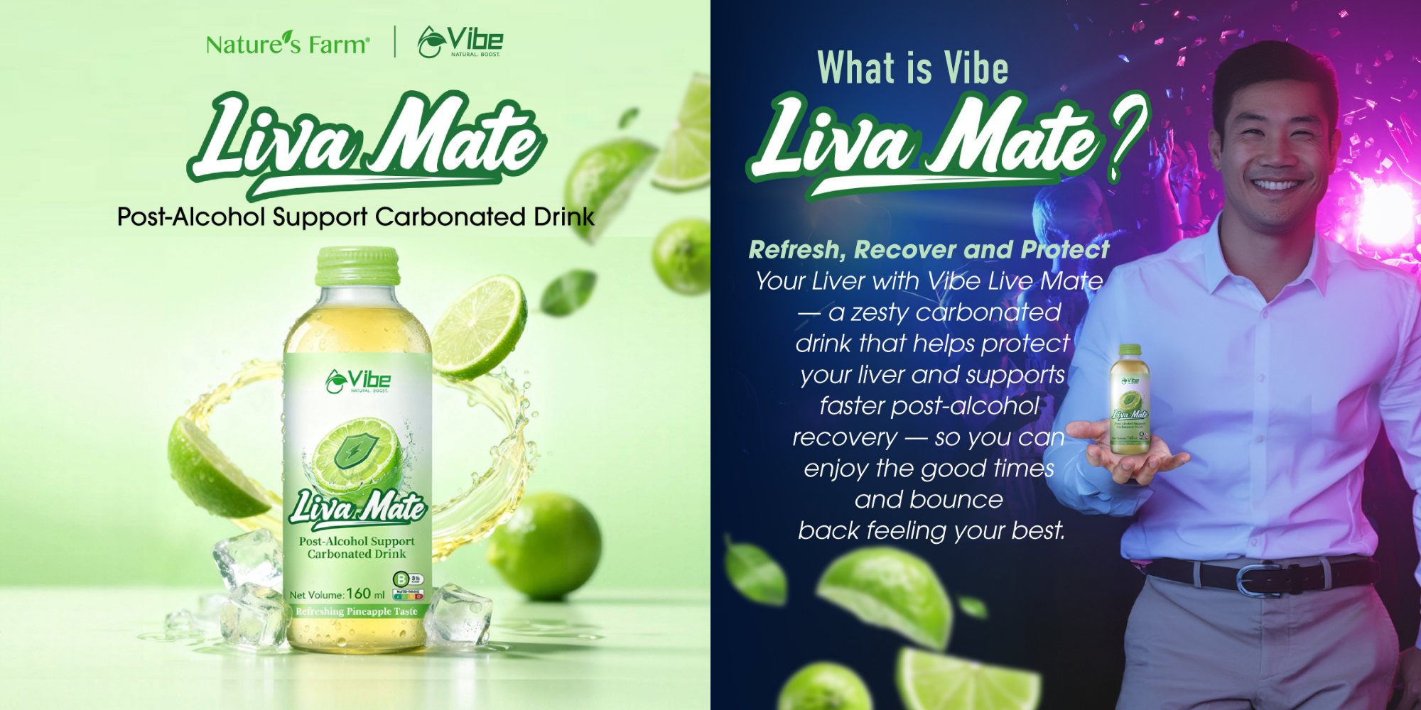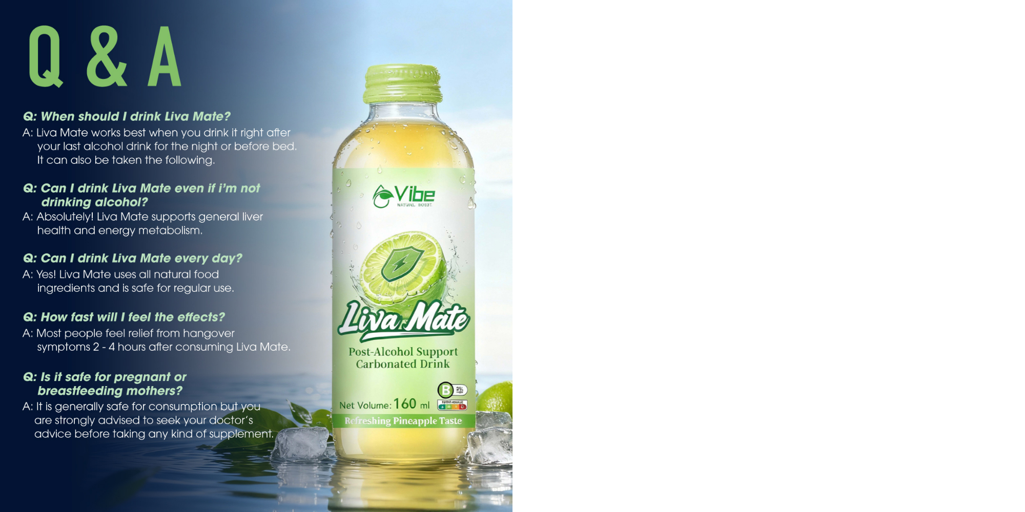 Refresh, Recover and Protect Your Liver with Vibe Live Mate — a zesty carbonated drink that helps protect your liver and supports faster post-alcohol recovery — so you can enjoy the good times and bounce back feeling your best.